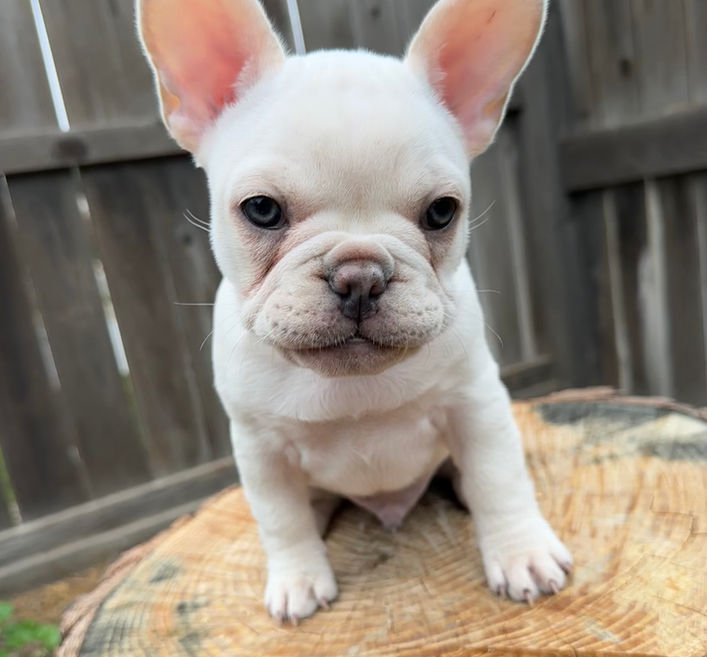This puppy is a stunning Platinum French Bulldog, genetically cream (e/e) with blue dilution (d/d) and chocolate-carrying (B/b). These genetics create the very light cream coat and soft pigment commonly referred to as platinum. Platinum is a color description based on genetic combination, not a single gene.